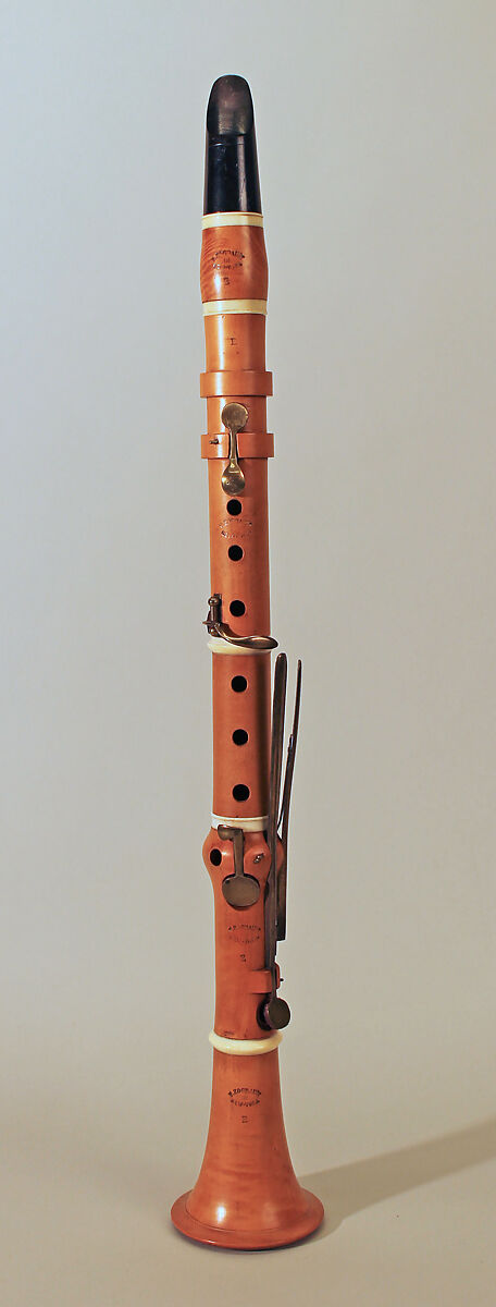 Technical description: Boxwood with ivory ferrules and brass keywork. Six pieces: mouthpiece, barrel, upper section, middle section for the fingers of the right hand, lower section with keys, bell. Rosewood mouthpiece not grooved for cord. Speaker liner projects ca. 4 mm into the bore. Chimney on the back of the instrument. Sixth key (C♯4/G♯5) mounted on a plate probably a later addition. Levers for L4, tone-hole and key for R4 mounted in a fusiform swelling. Integral wooden rim.