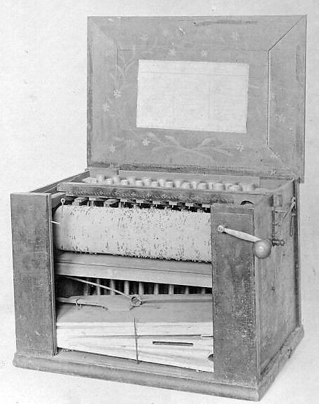 This tiny organ has three registers of pipes, stopped diapason, octave and fifteenth. It posses three additional barrels, which permit it to play a total of thirty tunes. The tunes are listed on a paper label inside the cover. There is no keyboard, but a pinned barrel is activated with a hand crank (which also pumps the bellows) in order to play a tune. Organs of this type were often used for teaching songs to birds.