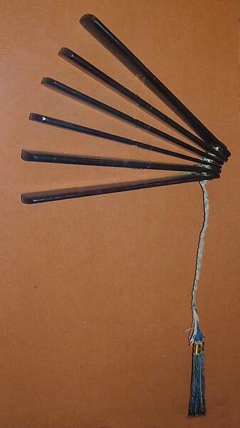 Description: six rectangular, red-lacquered slabs of pakdal wood, the slabs free at one end and having two holes in the other through which they are laced together by four strands of rawhide; imitation antique coins laced between each slab, the rawhide braided at ends and terminating in blue tassels.