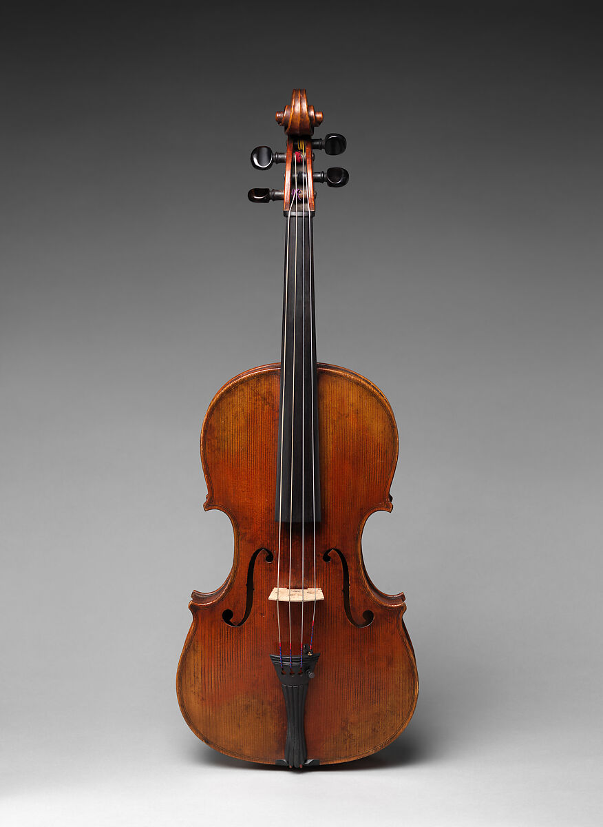 - Dimensions: Total L.: 67 cm (26-3/8 in.); L. of soundbox: 40.1 cm (15-3/4 in.); D. at edge at tailpiece: 4.9 cm (2 in.); Gr. W. of fingerboard: 5 cm (2 in.); Upper bout: 19.3 cm (7-5/8 in.); Center bout: 12.5 cm (5 in.); Lower bout: 24 cm (9-1/2 in.); L. of fingerboard: 29.4 cm (11-5/8 in.); Vibrating L. of strings: 36.9 cm (14-5/8 in.)