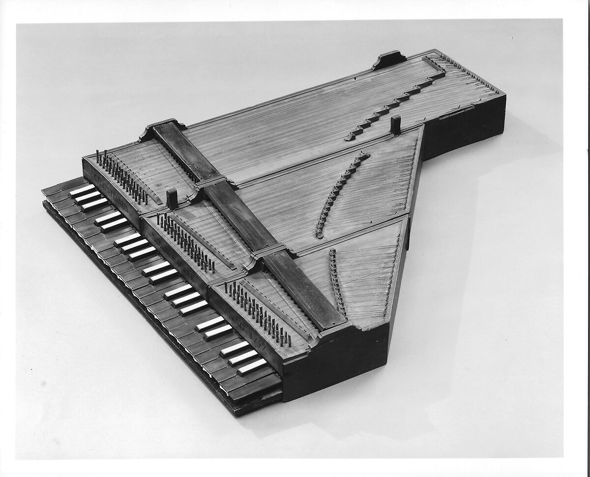 Technical description: Composed of one rectangular and two trapezoidal sections hinged together so that the sections fold into a rectangular box shape for travel, case of light brown wood (stained poplar?); compass C/e-c4, rosewood naturals with ivory arcades, accidentals veneered on the sides with rosewood and plated with ivory, two-rail keyframe, keys guided by pins between the rear ends of the levers, keyboard must be withdrawn to fold the instrument; jacks and tongues of pear, quill plectra, brass leaf springs, small lead weights, the jacks for the lower springs, small lead weights, the jacks for the lower 2/3 of the compass slotted for a single damper, box register is made by gluing blocks between two thin battens. (Douglas Maple 1983)