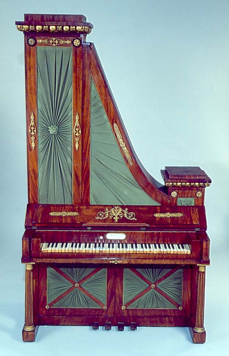 Technical description: Vertical mahogany veneer case curving upward toward left side, terminating in a square pediment surrounded with carved gilt molding, a smaller similar pediment at lower right side of curve, the ornaments formerly surmounting the pediments now absent; front vertical panels and 2 doors below keyboard backed with green cloth, with brass bead edging and cast brass ornaments; 3-piece hinged keyboard cover (holding music rack) decorated with brass mermaids, fleur-de-lis and other floral designs (central ornament broken); 2 fluted column legs at front, with vertical brass beading and brass collars at both ends; nameboard edged at top with ebony-ivory inlay and holding oval white glass nameplate framed in brass; compass EE-f4 (74 keys), ivory naturals (fronts missing), ebony slips over stained accidental blocks; 4 brass covered pedals; center pair coupled and operating mute stop, left shifting action for una corda, right raising dampers; German "hanging" action with escapement, hammers mounted in brass kapsels with spring return; stained soundboard; bridge entirely backpinned; square tuning pins (possibly replacements), note names stamped on pinblock, string gauges inked on bridge; strings up to d2 damped by felt and leather-padded L-arms mounted with screws to batten and returned by wire springs; probably 16 more dampers originally; top 45 notes triple-strung, remainder double-strung, lowest 6 notes wound; damper rail and pads possibly replacements.