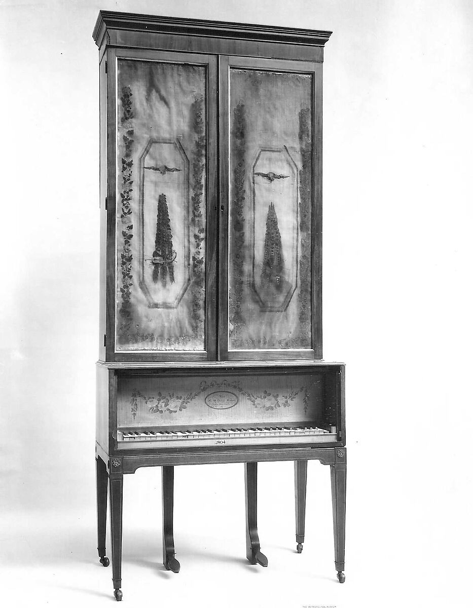 Technical description: Vertical rectangular mahogany-veneer case with two glass doors lined with velvet panels decorated with painted birds, flowers, and musical instruments; strings and soundboard occupy the left side of the cabinet, this space covered with a parchment panel decorated with a floral design, on the reverse parts of the eighteenth century English legal documents; two shelves occupy the cabinet's right side; keyboard surrounded by light wood panels bordered by mahogany, light and dark inlaid striping on nameboard, fallboard and keyboard lid, nameboard containing oval inlaid nameplate and a painted festoon of flowers on light wood ground; brass mounts on four square tapered legs with casters, two additional "legs" holding wood pedals beneath the case; action and keyboard slide out through hinged panel in back; compass FF-c4 (68 keys), ivory naturals with molded fronts, ebony accidentals, two pedals, left - una corda, right - damper; English upright action with escapement and back-check; hammers, located behind strings, striking towards the front; dampers also behind strings, pulled away by "L"-shaped arms coupled to key levers by stickers; triple strung throughout, no wound strings.