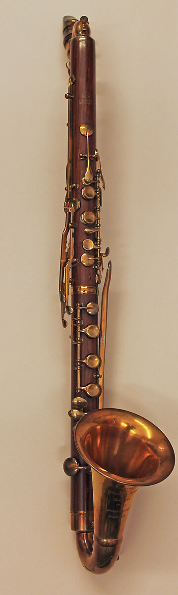 Technical description: Cocus wood with brass keywork, crook and bell. Five pieces: mouthpiece, crook, upper section, lower section, and upturned bell. Cocus wood mouthpiece intended for a ligature. Brass crook with device for a music card holder. Straight speaker, speaker tone hole on the back of the instrument featured with a chimney. Speaker liner projects ca. 4 mm into the bore. All tone holes under plates. Shaped thumb rest with sling ring directly above. End-pivoted key on L0. Only forked B♭3/F♮5. Vent key above R1. R1, R2 and R3 mounted on a rod-axle. 12 keys, 7 plates.
