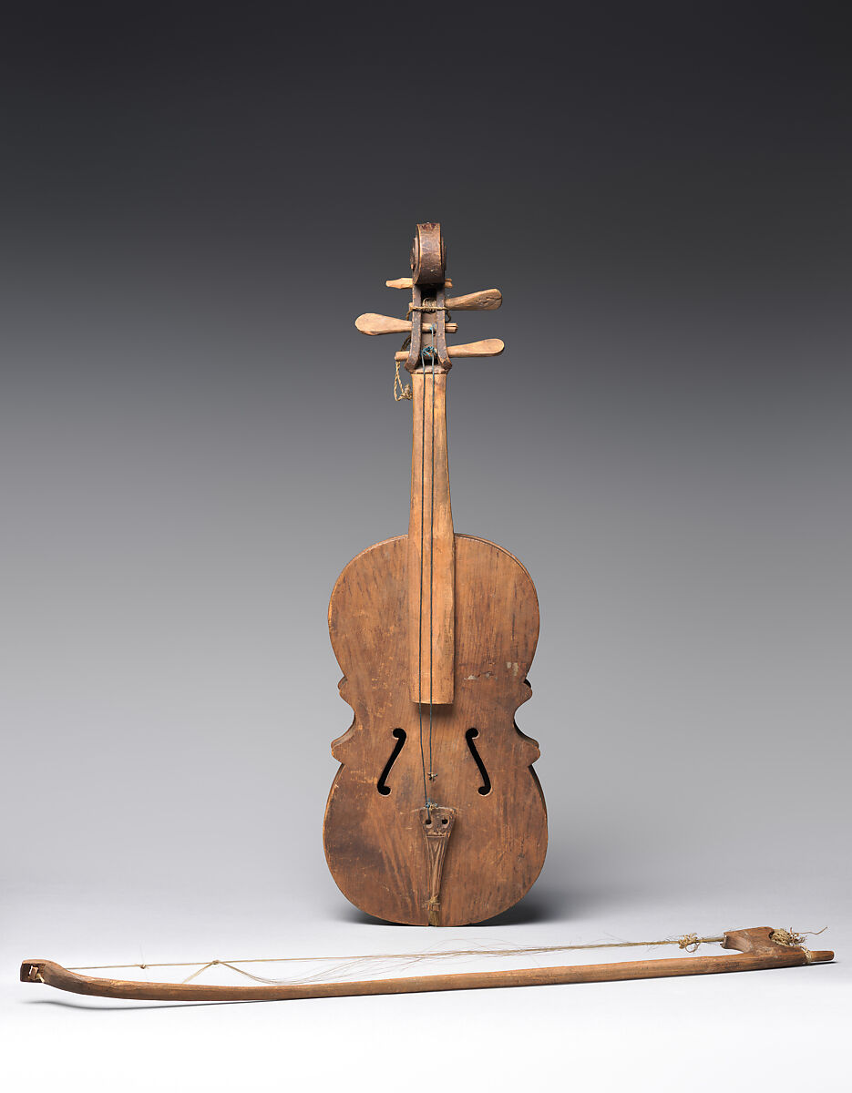 Technical description: Folk violin with bow. Flat (slightly bent) one-piece pinewood top. Back, ribs, and neck carved from one piect of wood. Two S-shaped soundholes. Pinewood fingerboard. Bridge missing. Accompanying bow. (Karel Moens, 1991)