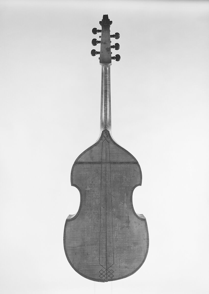 Technical description: intact except for neck; body of classical English viol proportions; opaque reddish-brown varnish; table of spruce in five pieces; back of maple in two pieces; ribs of similar maple to the back; table richly ornamented with double purfling, with an inlaid rosette of maple with figured parchment backing and a single purfling surround beneath the fingerboard; the back with double purfling extending inwards toward the center joint in a cross-over pattern at the top and bottom block areas; tuning: D, G, c, e, a, d'. (William Monical, 1977)