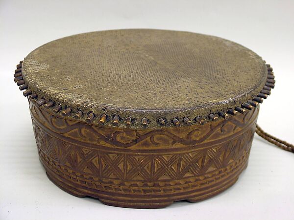 This Nepalese frame drum is made of iguana skin stretched across a carved wooden shell. Large examples, like this, are often used in the accompaniment of dances known as chudka and kauda, which are performed by members of the Magar, Gurung, and other indigenous communities in Mid-Western Nepal during social activities. Smaller khaijadi drums are used by members of other ethnic groups, like Brahmin and Chhetri, in devotional music known as bhajan. In other parts of Nepal, India, and Pakistan, frame drums (such as the khanjari, kanjira, and damphu) are also used in devotional music traditions. The names of these drums are often interchanged, although they are used in many different musical traditions.