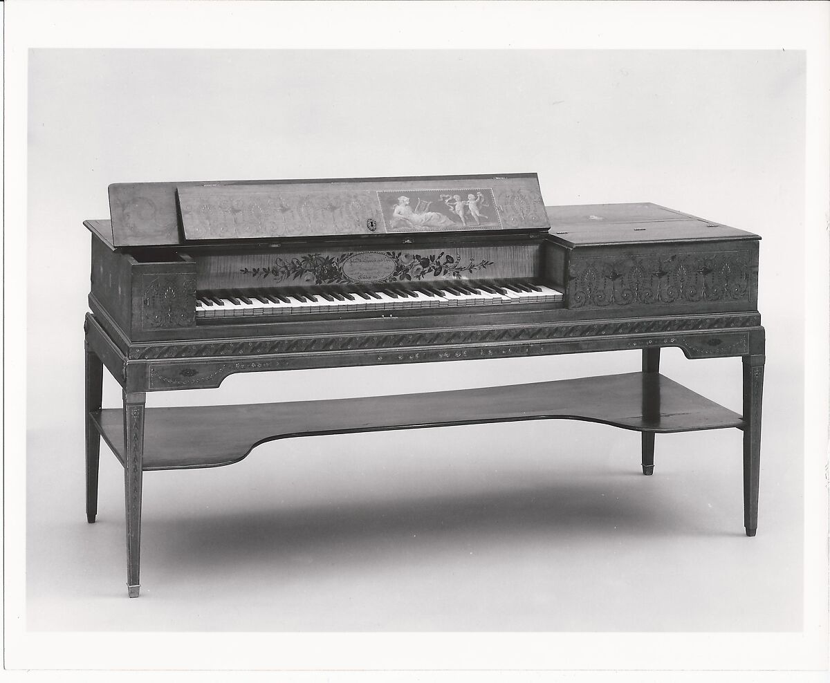 Technical description: Mahogany veneer case painted with classical scenes including the Judgment of Paris on the center of the top lid panel. The smaller panel in the center of the front of the lid contains a painted scene of a reclining Venus with two cupids, in grisaille within border of painted beads; top, four sides, legs, and shelf painted with ornamental designs of rinceaux, laurel garlands, scrolls of graduated beads, medallions with figures, heads or trophies, borders of ribbon and flower, anthemion and classical lamp motives or husks, chiefly in green, brownish red, cream, tan, brown, and gray with accents of white and crimson. Sixty-eight keys (FF-c4) with ivory naturals and ebony accidentals. English single action mechanism with no escapement.