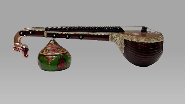 Also known as a Sarasvati vina, this plucked lute is the principal stringed instrument of South Indian classical music. The ekanda vina, a Tanjore style, with body and neck is made from one piece of wood is highly valued for its tone. This type of vina features railings on each side of the neck to provide a platform for metal frets which are adhered with wax. The decoration with a golden dragon (yali) head and painted upper gourd-shaped papier-mâché bowl at the upper end distinguishes this type from the Hindustani bin, an instrument also referred to as a vina. This instrument was owned by C. S. Narasimhan, the last owner of Swadesamithran, the first Tamil newspaper owned and operated by Indians.