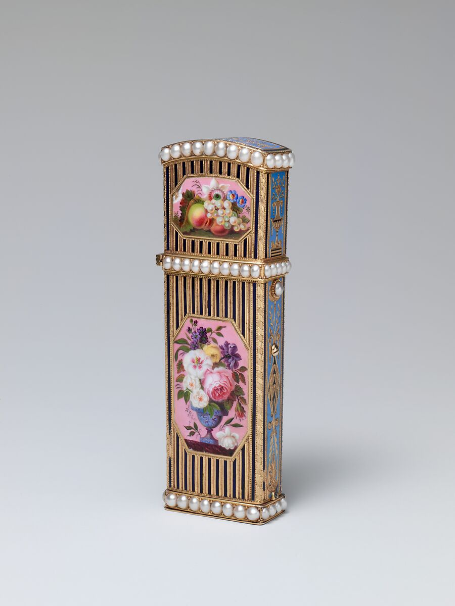 Gold music box in the shape of a fitted necessaire, featuring four reserves, three decorated with flowers, one blank for engraving initials, vertical blue enamel stripes and bands of half pearls.