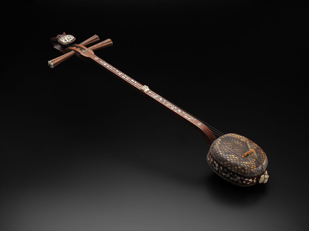There are two main forms of the sanxian: a large one from the North, with a thin metal plate attached inside to enrich the sound; and a smaller version from the South. Like the pipa, the sanxian may accompany narrative song, changing its tuning to accommodate the singer. The bat decorating the finials of these instruments is depicted on many Chinese objects and is a symbol of good luck.