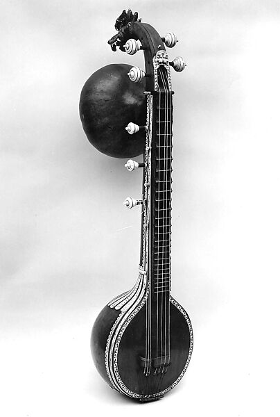 Although this instrument is a lute of south (Carnatic) India, it has fixed frets (metlu) and a name like an Indian zither (vina). Its wood body is carved, and there are four melody strings and three open (tāla) strings. The fantastic creature at the upper end is a yāli. Sarasvat, the Hindu goddess of music, art and education, lends her name to the instrument, with the hope that music will lead to understanding.