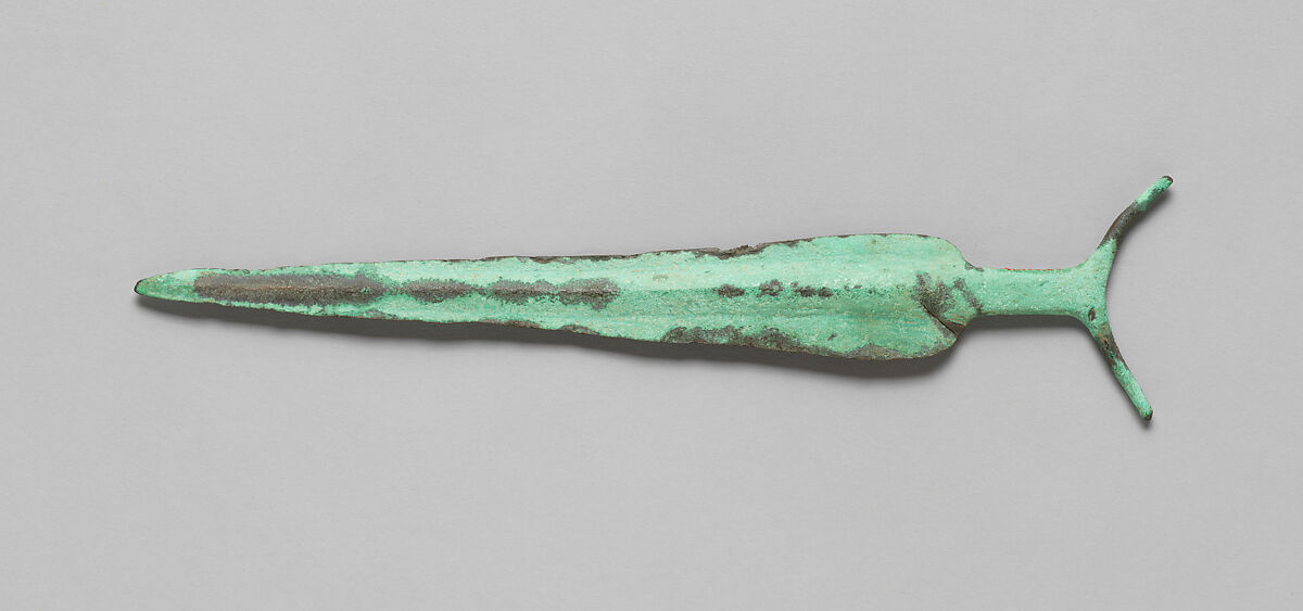 These anthropomorphic figures, harpoons, ax blades (celts), and antennae swords were cast and hammered from unalloyed copper. They may be dated to 1500 to 1000 B.C. Given that pure copper is a relatively soft metal and most of the objects show little or no signs of wear, it seems likely that their function was largely dedicatory. Hoards of such objects have been found across north India, the greatest concentration being in Uttar Pradesh. The findspots suggest they were ritually deposited in rivers or marshes, though several related antennae swords were recorded in late Indus Valley civilization (ca. 1500 B.C.) burials at Sanauli.