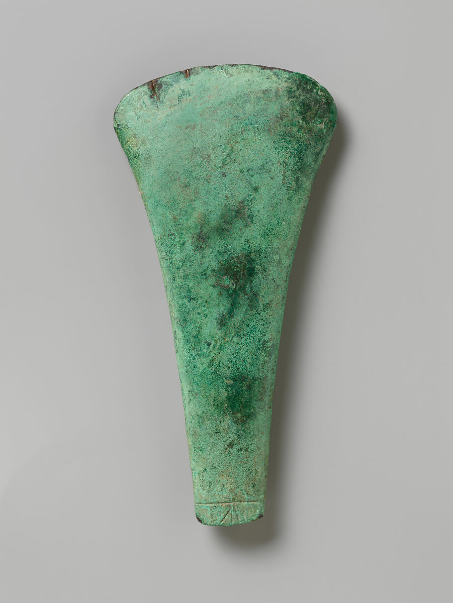 These anthropomorphic figures, harpoons, ax blades (celts), and antennae swords were cast and hammered from unalloyed copper. They may be dated to 1500 to 1000 B.C. Given that pure copper is a relatively soft metal and most of the objects show little or no signs of wear, it seems likely that their function was largely dedicatory. Hoards of such objects have been found across north India, the greatest concentration being in Uttar Pradesh. The findspots suggest they were ritually deposited in rivers or marshes, though several related antennae swords were recorded in late Indus Valley civilization (ca. 1500 B.C.) burials at Sanauli.