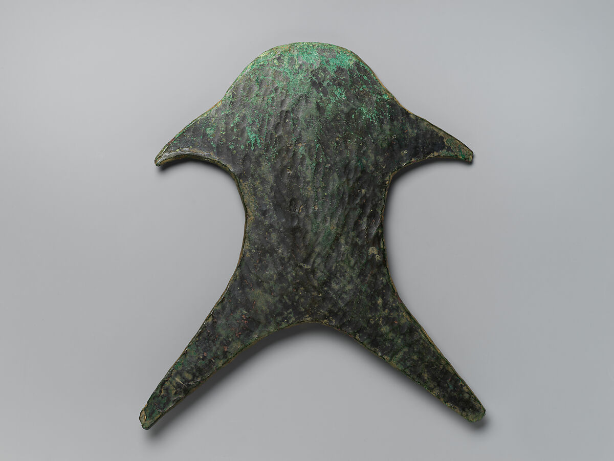 These anthropomorphic figures, harpoons, ax blades (celts), and antennae swords were cast and hammered from unalloyed copper. They may be dated to 1500 to 1000 B.C. Given that pure copper is a relatively soft metal and most of the objects show little or no signs of wear, it seems likely that their function was largely dedicatory. Hoards of such objects have been found across north India, the greatest concentration being in Uttar Pradesh. The findspots suggest they were ritually deposited in rivers or marshes, though several related antennae swords were recorded in late Indus Valley civilization (ca. 1500 B.C.) burials at Sanauli.