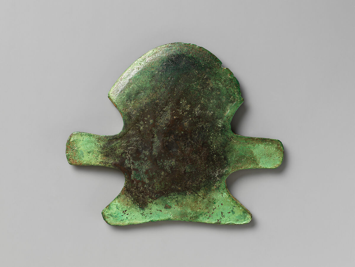 These anthropomorphic figures, harpoons, ax blades (celts), and antennae swords were cast and hammered from unalloyed copper. They may be dated to 1500 to 1000 B.C. Given that pure copper is a relatively soft metal and most of the objects show little or no signs of wear, it seems likely that their function was largely dedicatory. Hoards of such objects have been found across north India, the greatest concentration being in Uttar Pradesh. The findspots suggest they were ritually deposited in rivers or marshes, though several related antennae swords were recorded in late Indus Valley civilization (ca. 1500 B.C.) burials at Sanauli.