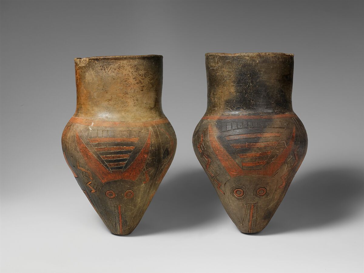 From about 700 B.C. to A.D. 700 the Paracas and later the Nasca resided along the southern coast of Peru. One feature the two cultures had in common was the use of a uniquely shaped ceramic drum with a cylindrical collar covered by a skin membrane that opened into a bulbous, hollow body terminating in a closed point. The significance of these rare and early examples of a past musical culture is yet to be fully explored. The largest of the amphora-like drums, 15 to 18 inches tall, were frequently decorated with incised and polychrome anthropomorphic and mythical beings. It has been suggested that these larger drums were for ritual use. The Museum’s pair of drums are small by comparison and were perhaps played differently and in a different context. Iconographical evidence implies that they may have been bound together and strapped to the player’s waist. The incised and painted decoration evokes nature. Scholars have suggested that the birds placed at the cardinal points around the drum’s body, their beaks pointing to the narrow terminus, are hummingbirds and whip-poor-wills.