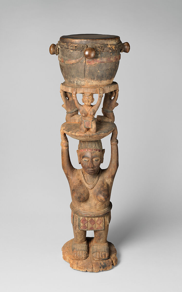 The a-ndëf (also te-ndëf) is a caryatid drum found in the music-making traditions of the Baga, an ethnic group in western Guinea. It is associated with a-tëkän, the Baga institution for female solidarity, and is played at various events of importance to women. The form of the instrument–specifically, the depiction of a female figure supporting a globular object on her head–is common to Baga drums. It is also evocative of Baga women’s roles in society. Not only do women carry large clay water vessels or baskets for food, notably rice, on their heads, “[w]omen are the bearers of Baga society in every sense of the world,” art historian Frederick Lamp explains (1996: 124).