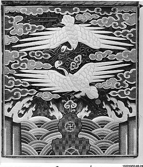 Various animals were used to designate rank, and the motifs evolved over the course of the Joseon dynasty. In 1871 the insignia were standardized to tigers for military officials and cranes for civil officials. The examples here are arranged clockwise by rank, from the highest, the double crane with bullocho (elixir plant) on the upper left, to the lowest, the single crane on the lower left. Considered elegant and pure, cranes also symbolize longevity, as does the bullocho. The surrounding clouds, waves, and rocks are auspicious motifs also featured in the adjacent painting. The hyungbae system was suspended in 1899