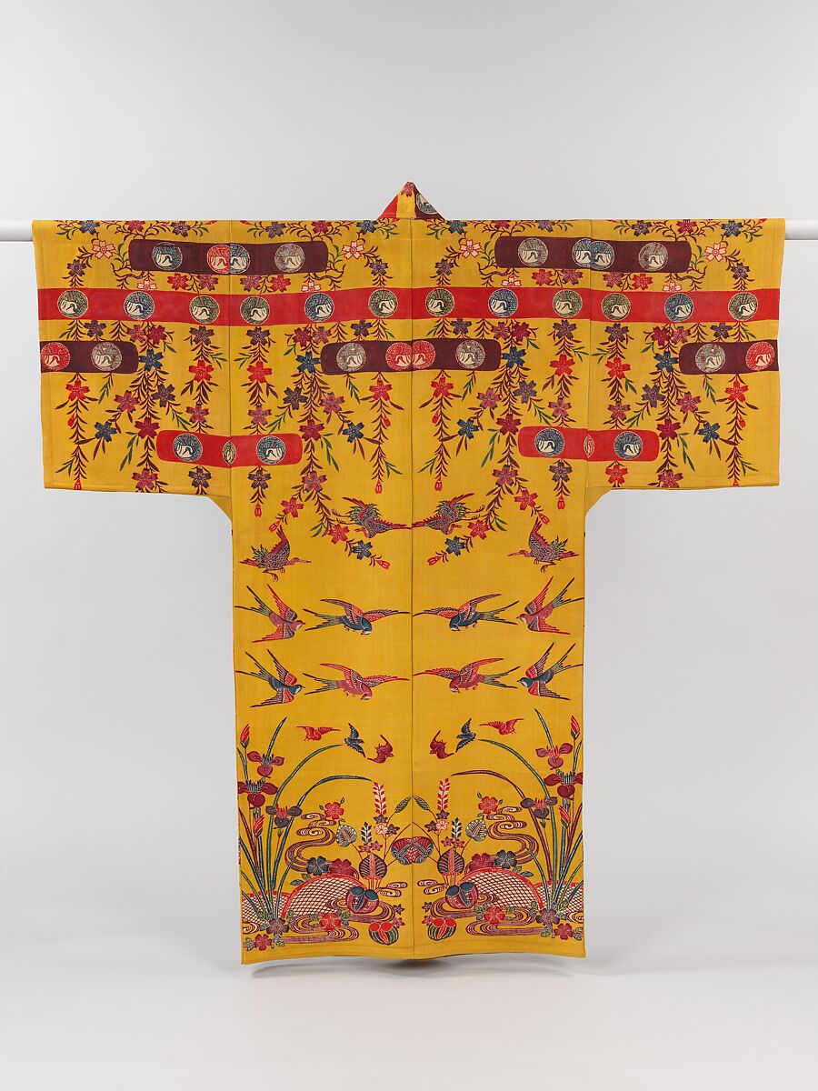 The bingata dyeing technique used for this garment involved the application of resist paste through one or more stencils, as well as the application of dyes and pigments to pattern areas with a brush. Usually, the colored designs are covered over with protective paste before the background is dyed, and, finally, the paste is washed off, revealing the vibrant colors and spirited designs that are typical of bingata.