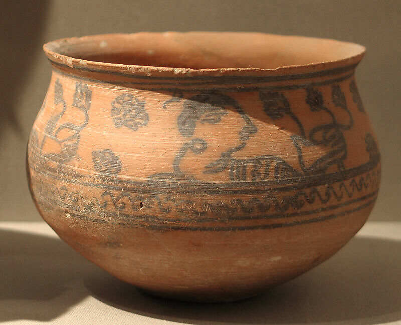 The figural and decorative black painting was done when the slip was still wet, giving a distinct, slightly blurry effect that is characteristic of ceramic ware produced at this time in the Bajaur Valley, at the Afghanistan border. Bajaur terracottas of this type are usually embellished with animals or with rows of women making offerings.