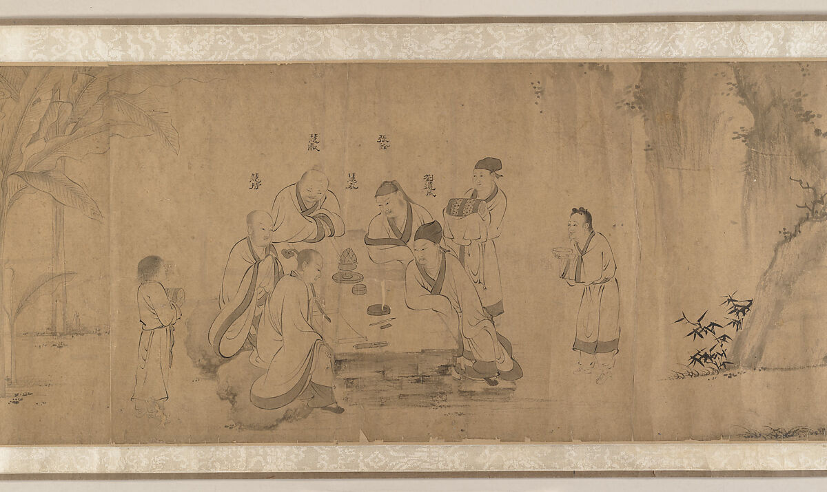In 386 CE, Huiyuan, founder of the Pure Land sect of Buddhism, built a monastery at the foot of Mount Lu in Jiangxi Province. This became the meeting point for his newly founded White Lotus Society—a group of scholars and monks from China, India, and Central Asia—to discuss and debate the Buddhist faith, which was still relatively new to China. Included in the group were men now best remembered for their poetry, including Tao Yuanming and Xie Lingyun. Images of the White Lotus Society later become popular as painting subjects; this copy, likely made in the fifteenth century, purports to preserve a version by the Northern Song master Li Gonglin.