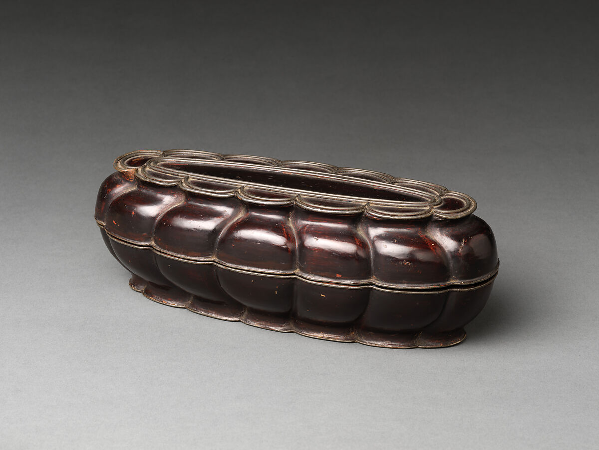 Lacquer boxes with lobed sides and pewter trim are typical of Yuan-dynasty artwork. Many were fitted with an interior tray that probably held cosmetics, combs, hairpins, and other adornments. This box represents a creative design that transforms a twelve-petal flower form into an elongated oval.