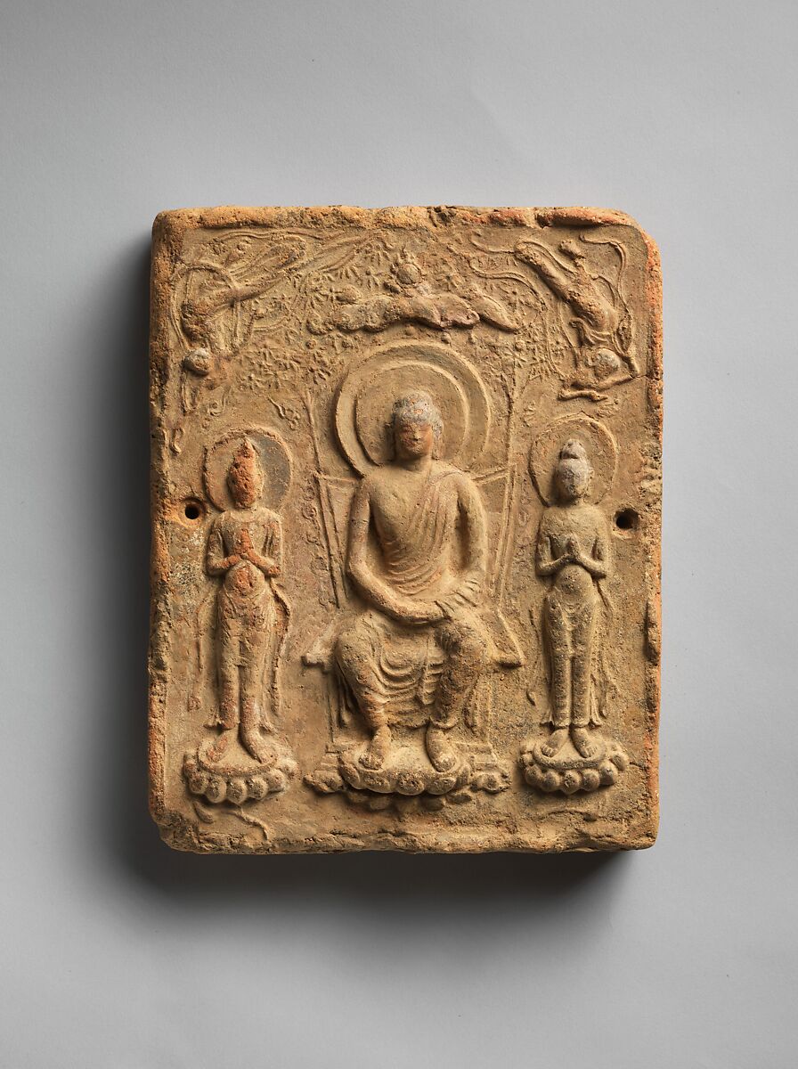 Clay relief tiles with figures of the Buddha, known as senbutsu, were made for only a short period of time, between the second half of the seventh and the early eighth century. Here, the Buddha sits beneath a canopy with two (unidentifiable) attendant bodhisattvas in front of the sacred bodhi tree. This example is believed to have been an interior wall decoration at Tachibanadera Temple in Asuka, near the ancient capital of Nara.