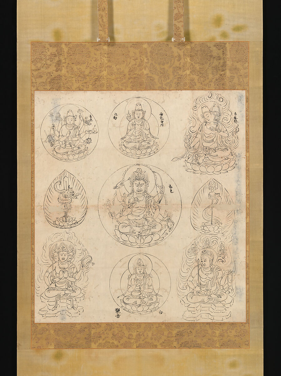 This drawing describes a mandala used in ritual to prevent disaster and increase happiness. Fierce and angry at center, the Wisdom King Aizen is joined by three bodhisattvas, identifiable by their circular body haloes, and three other Wisdom Kings, each wrathful like Aizen and surrounded by flames and carrying weapons. The monk who transcribed this scroll in 1107 at the temple Shōren’in in Kyoto left indications of which colors, white or red, were to be used for the flesh of several of the deities. Though not noted, blue was conventionally employed for the Wisdom Kings at lower left and right.