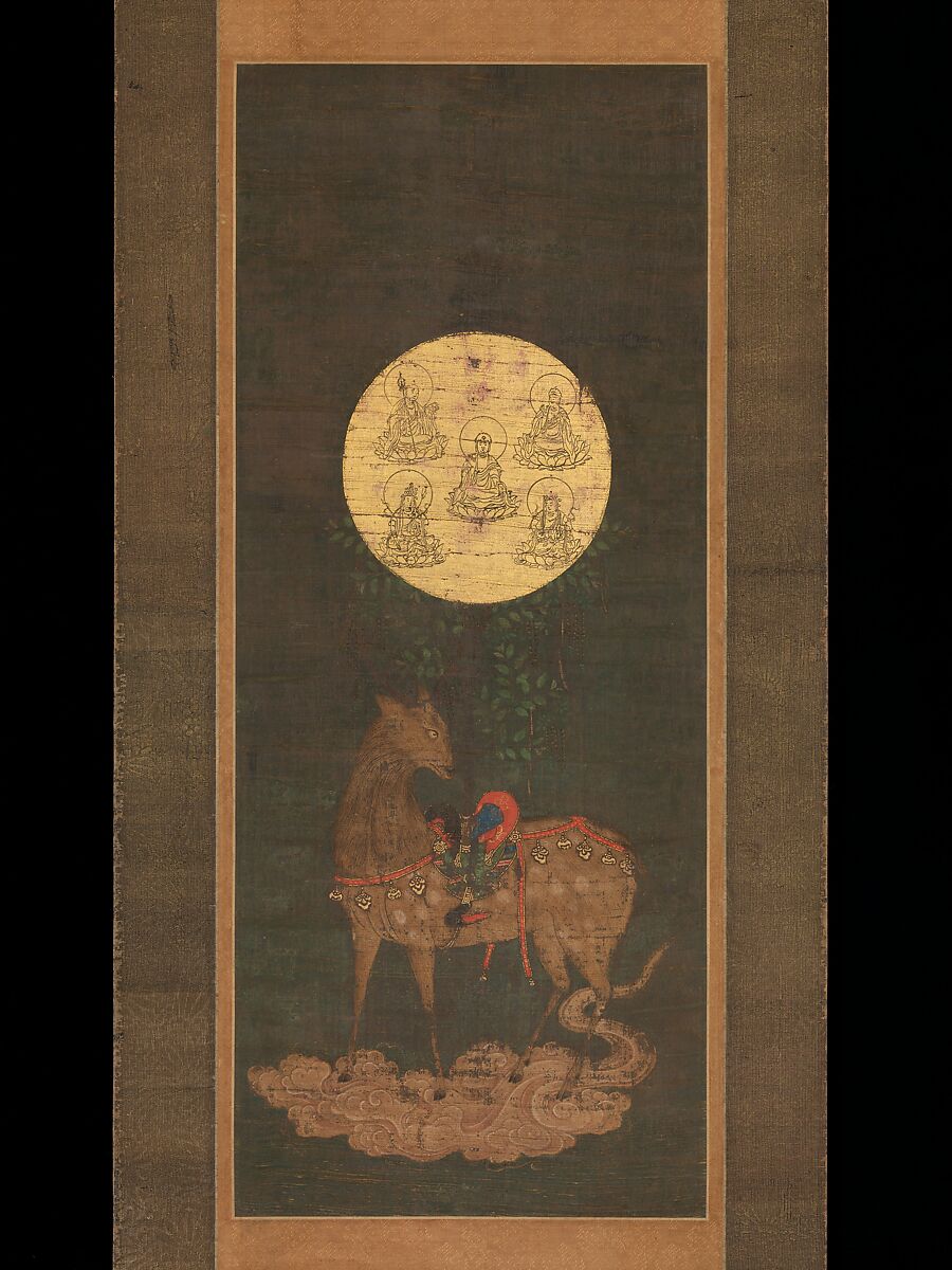 By the fourteenth century, tendencies toward the synthesis of Buddhism and Shinto led to the belief in Shinto kami as manifestations of Buddhist deities. The deer, vehicle of the deity Takemikazuchi, rides on a cloud and wears a colorful saddle that supports an evergreen sakaki tree interlaced with wisteria vines. At the tree’s canopy is a golden mirror that includes images of the five Buddhist deities associated with the kami of the Kasuga Shrine in Nara.