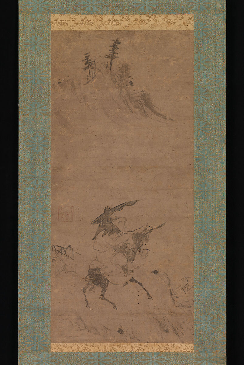 The artist, Bokudō Sōjun, was a Zen monk from Tenryūji Temple in Kyoto. His use of gold outlines on Su Shi’s hat, headcloth, and the bridle bit, touches of brightness in an otherwise austere composition, may have been influenced by professional painters of the era who used gold highlighting in Buddhist paintings.