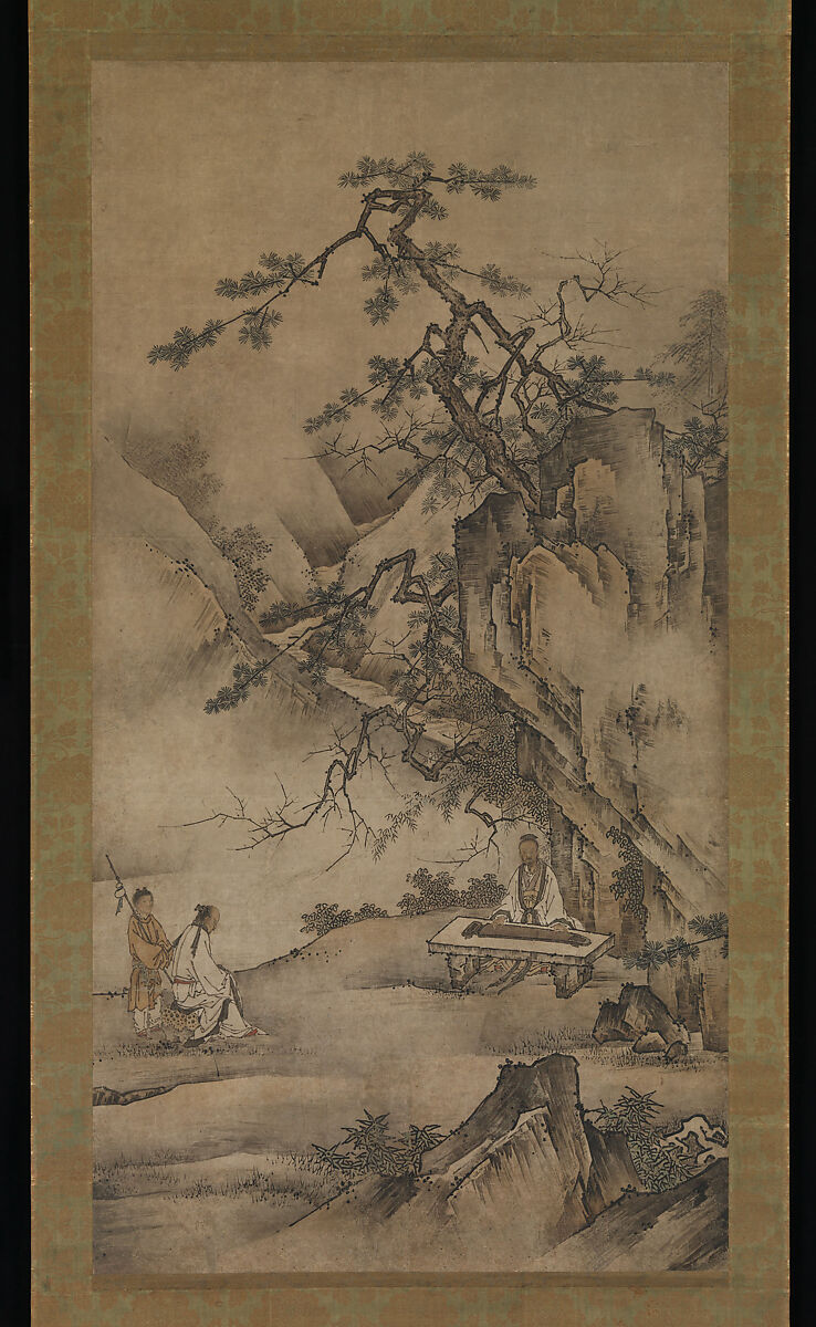 Likely once part of a set of sliding-door panels (fusuma), this painting depicts Bo Ya and Zhong Ziqi taking shelter from a storm beneath a cliff, where Bo Ya plays his qin to pass the time. The work bears no seal or signature but exemplifies the formal landscape style of the early Kano school and was traditionally attributed to the school’s founder, Motonobu. Discrepancies with Motonobu’s accepted style, however, suggest that the artist was active in Motonobu’s circle, probably during the 1530s.