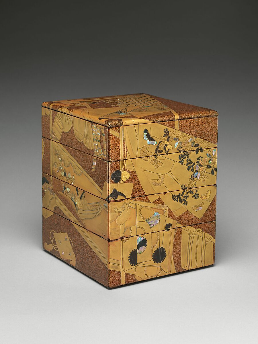 - Title: Stacked Food Box (Jūbako) with “Whose Sleeves?” (Tagasode) Design