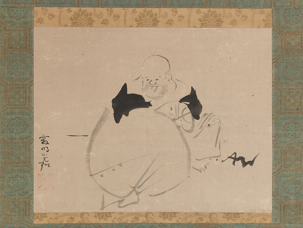 Hotei was probably first portrayed in painting soon after his death and later entered the folklore of China and Japan as one of the Seven Gods of Good Fortune (Shichi fukujin). In his ink paintings of august East Asian mythological and historical personages, Ogata Kōrin often portrayed the seven gods in a more playful aspect, as seen here.