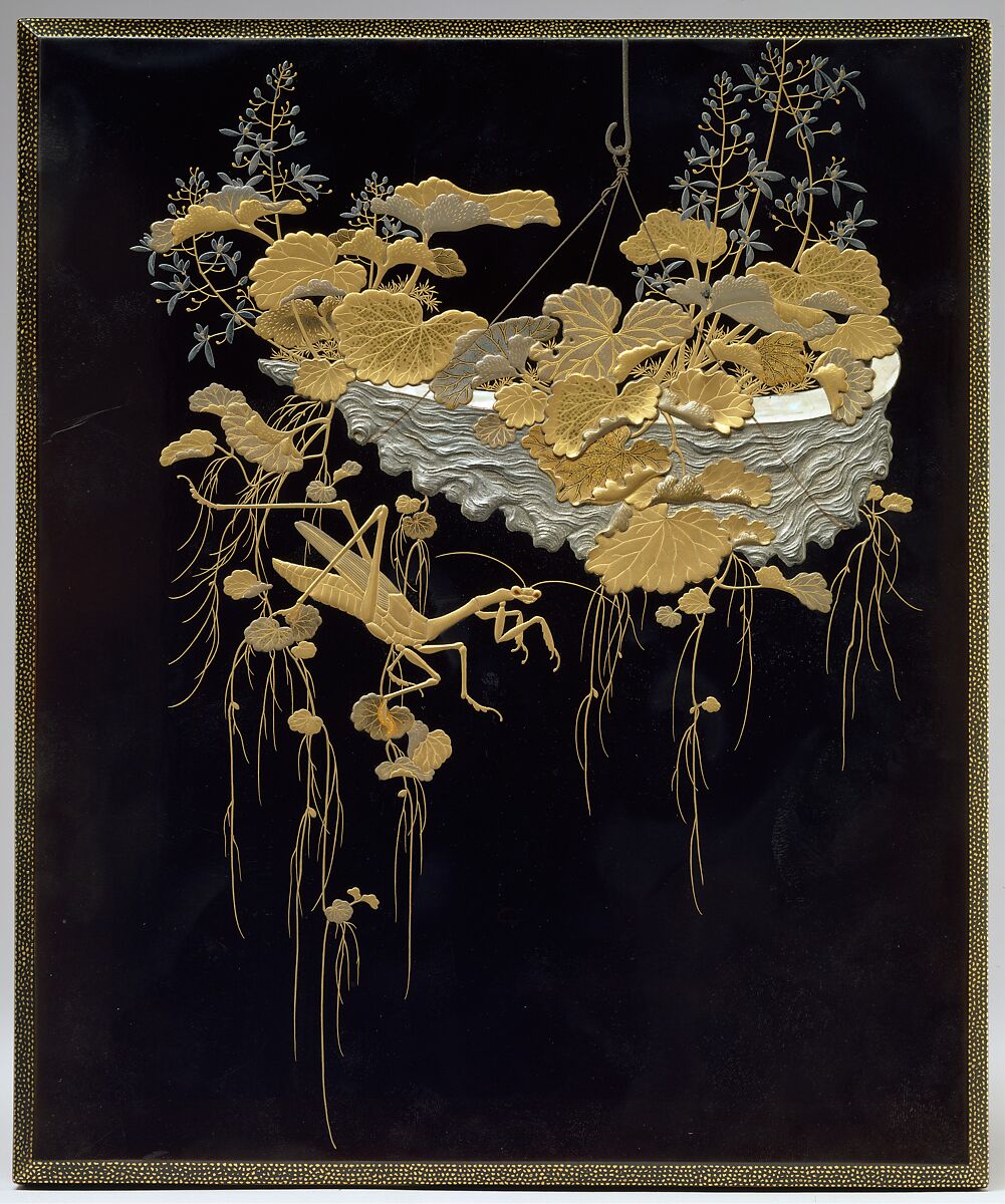 - Medium: Lacquered wood with gold, silver takamaki-e, hiramaki-e, cutout gold foil application, mother-of-pearl inlay on black lacquer ground