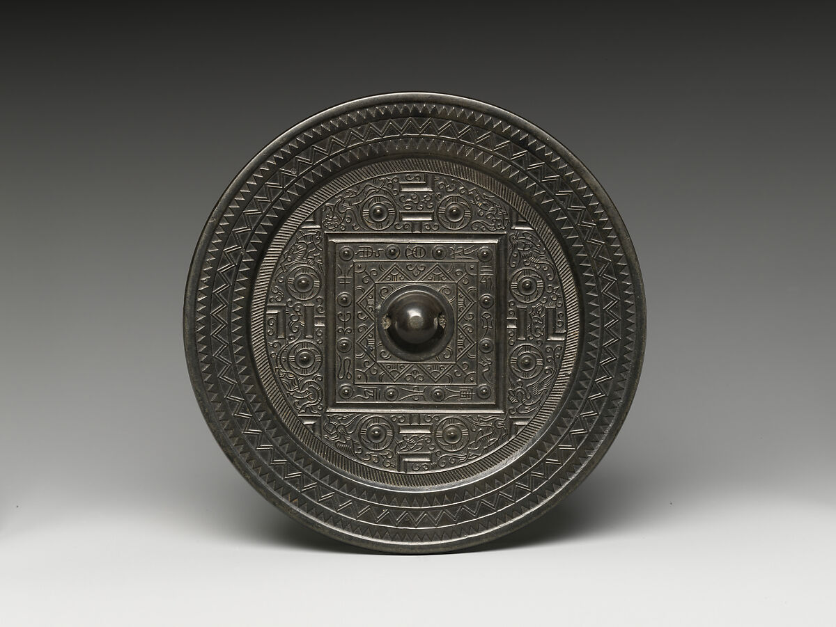 On the back of this mirror, a diagrammatic decoration points to a new cosmology. The square world—aligned with the four cardinal directions and inscribed with the “twelve earthly branches” used to compute the calendar—is surrounded by the circular heavens, in turn ringed by the waves of the cosmic ocean. Animals of the four directions (the green dragon of the east, white tiger of the west, red bird of the south, and entwined black turtle and snake of the north) and other mythical creatures share the heavens with T-, L-, and V-shaped markings. These recall the measuring devices and rulers used by Fu Xi and Nu Wa, who were believed to have created the universe.
