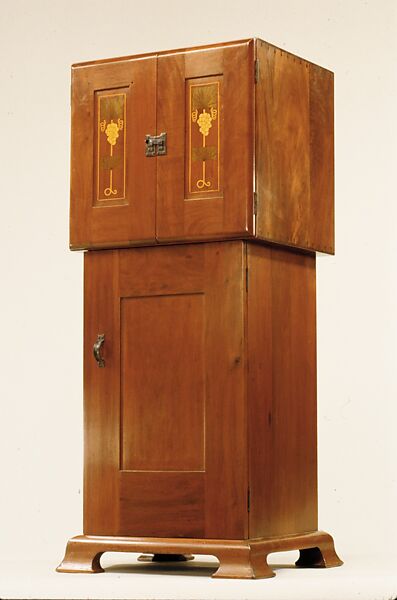This mahogany music cabinet, a product of the brief collaboration, from March 1903 to January 1904, between Gustav Stickley and the Prairie School architect Harvey Ellis, departs from the typical Stickley Craftsman furniture in its unusual form, bracket feet, subtle structural detailing, and in the use of marquetry in pendant panels that feature stylized grape clusters and leaves hanging from curling vines. An illustrated article in the January 1904 issue of "The Craftsman," a periodical promoting the Arts and Crafts movement and published by Stickley between 1901 and 1916, carefully explains that inlay was justified here because it emphasized the structural, and particularly the vertical, lines of the object.