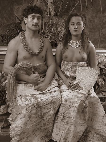A Samoan couple sits for a wedding portrait dressed in siapo, or bark cloth, and ceremonial adornments: necklaces of cowrie shells and segments of pandanus fruit, a fan woven from leaves of the same tree, and a fue, or fly whisk, braided from coconut fibers. The picture adheres closely to studio tableaux made in the late nineteenth and early twentieth centuries for a Western market hungry for exotic images. Here, however, both roles are played by Shigeyuki Kihara, who was assigned the gender male at birth but identifies as fa’a fafine (“in the manner of a woman”). By embracing this third gender and transposing her disguised head onto a male torso, Kihara refuses binary positions, challenges sexual stereotypes, and subverts long-held Western perceptions of Pacific bodies.