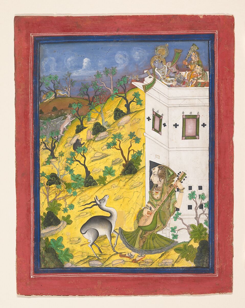 The rugged, inhospitable terrain of Rajasthan, a favorite setting for Kota court artists, provides an unlikely context for a dalliance with the god Krishna. A prominent hunting tower—built to facilitate the shooting of animals driven into range by beaters—overlooks the sparsely wooded landscape. In the foreground, a female musician sits before the tower playing a sitar, while a mrig (a type of musk deer) stands before her, transfixed by the music. From the turret of the tower, Krishna gestures toward a leopard retreating over the horizon; another big cat climbs the hill.