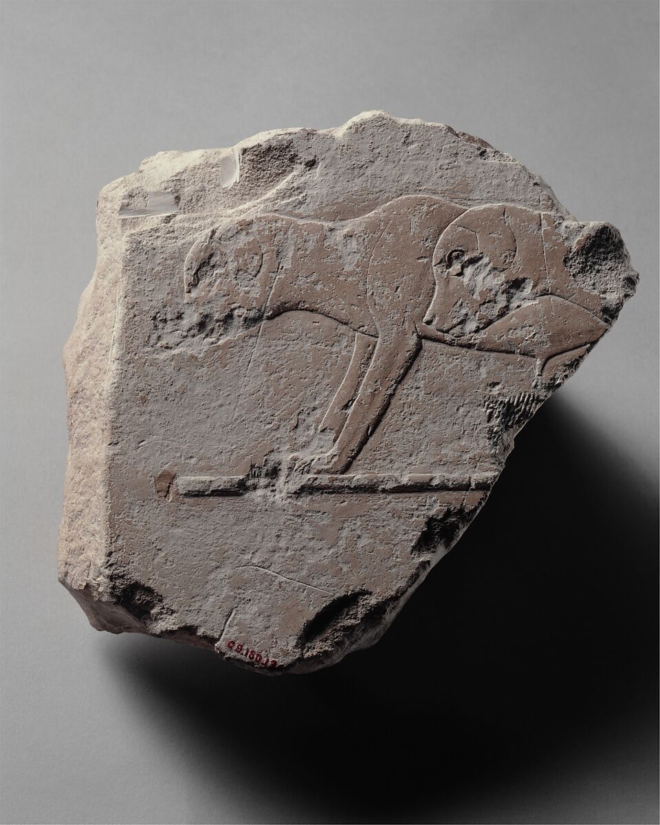 Two puppies stand side by side with slightly lowered heads, as if hesitating to approach some problem or adversary they cannot yet handle. They must have belonged to a subregister of a larger composition-perhaps a hunt in the desert. The impression of overlap is achieved by the use of incised lines that slope up into the surface of the relief rather than by actual variations in height. This technique, used from the time of Niuserre onwards, allowed much easier execution of intricate groupings.