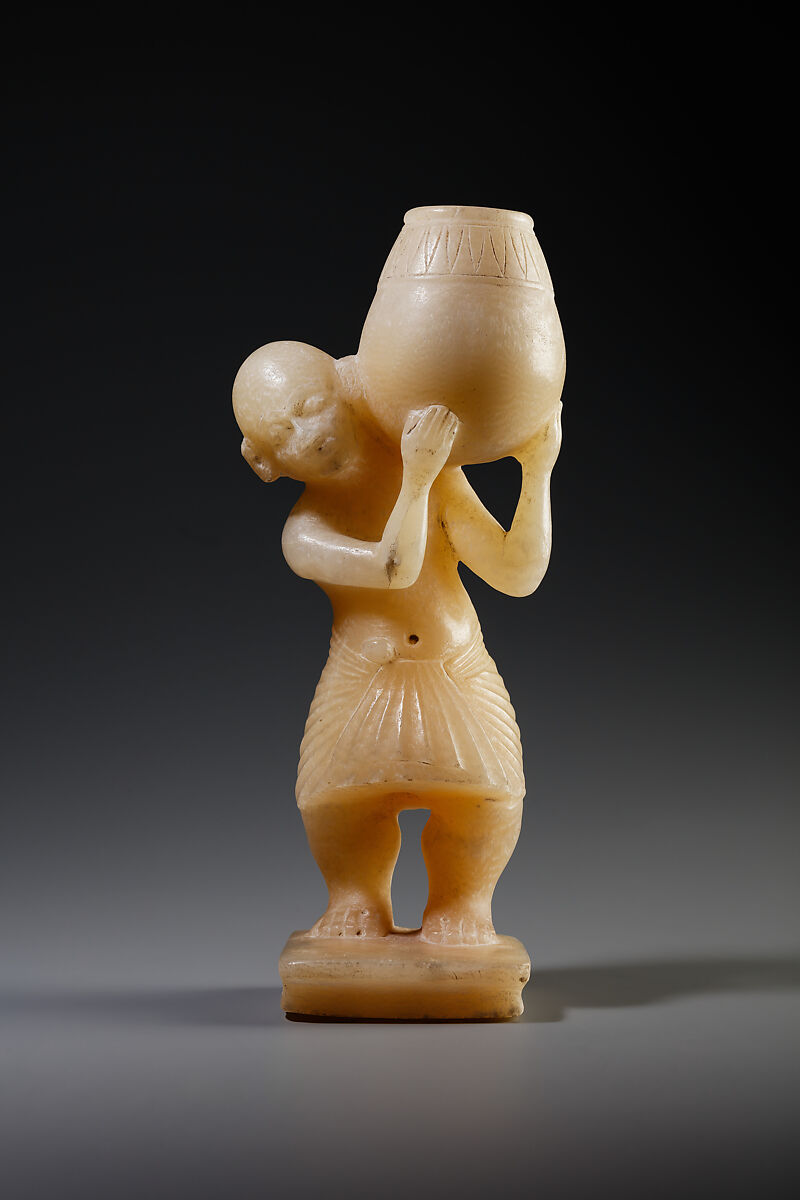 The twisting motion of the dwarf carrying a heavy storage jar on his shoulder defies the usual rigid frontality of Egyptian statuary, making this a true piece of sculpture in the round. Such an artistic liberty was acceptable for whimsical representations of anonymous servants but never would have been allowed in formal sculpture, even in the more expressive art of the Amarna period.
