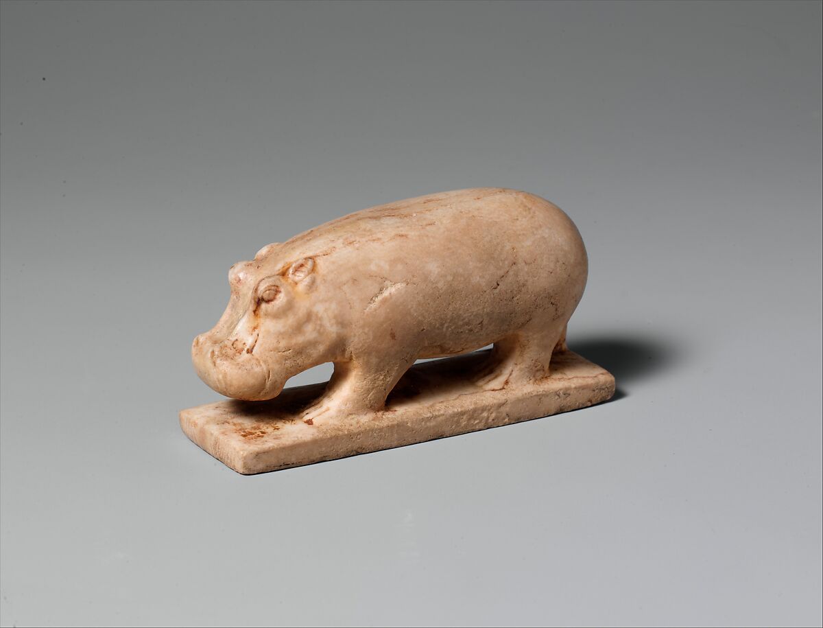 Hippopotamus figurines made out of blue faience and without a base were popular in the Middle Kingdom and Second Intermediate Period and the piece here was originally dated to this time. However, a very similar hippopotamus statuette, which must have been an export from Egypt, has been found on the Greek island of Samos. The archeological context of the piece found in Greece dates it to the 8th to 6th century B.C. and a group of small hippopotamus statuettes on bases, and made out of a white material, likely belong to the same period.
