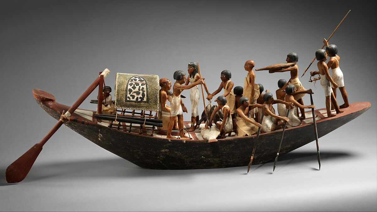 Among the pleasures of an Egyptian noble's life were hunting excursions in the Nile marshes to fish and hunt birds. Papyrus rafts or light boats such as this were used for such excursions. Here, Meketre and his son or companion are watching the hunters from a light shelter made of woven reeds and decorated with two large shields. In the prow, two men aim harpoons at some fish, while amidships a kneeling fisherman removes the harpoon from a bolti fish. An earlier catch, a large Mormyrus, is being presented to Meketre. A bunchof coots, caught previously in a clapnet, are presented by a man and a woman, who wears a bead net over her shoulders, brings a duck. The poles of the clapnet are now lashed to the grilles of the shelter; the net pegs lie on the deck. The presence of females from a noble's family in such marsh scenes is a recurring theme in Egyptian art.