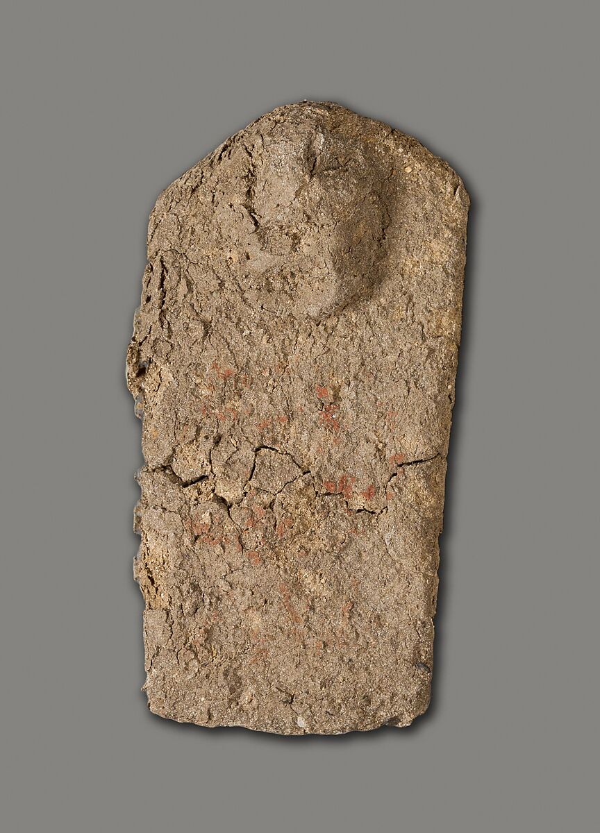 These tablets of unfired clay with attached crude faces were found as a group by the Museum's excavators at Lisht South in loose surface sand west of the mastaba of Senwosretankh, a high official and possibly the architect of the pyramid complex of Senwosret I (ca. 1961–1917 B. C.), east of which he erected his own very elaborate mastaba tomb (see acc. nos. 33.1.2 and other pieces). The mud figures and little coffin (acc. no. 33.1.66) that had contained some of them must have been buried, however, considerably later than the early twelfth dynasty tomb close to which they were found. In fact, during the thirteenth and following dynasties people deposited a number of objects in the by then sacred area around a legendary ruler's pyramid and its dependant monuments, believing conceivably that potent magical powers could thus be released. These flat mud figures, for instance, are inscribed in now much-faded red paint with the names of men identified as enemies (most of them Egyptians but some with foreign names). Their deposition may have been thought to effect their destruction.