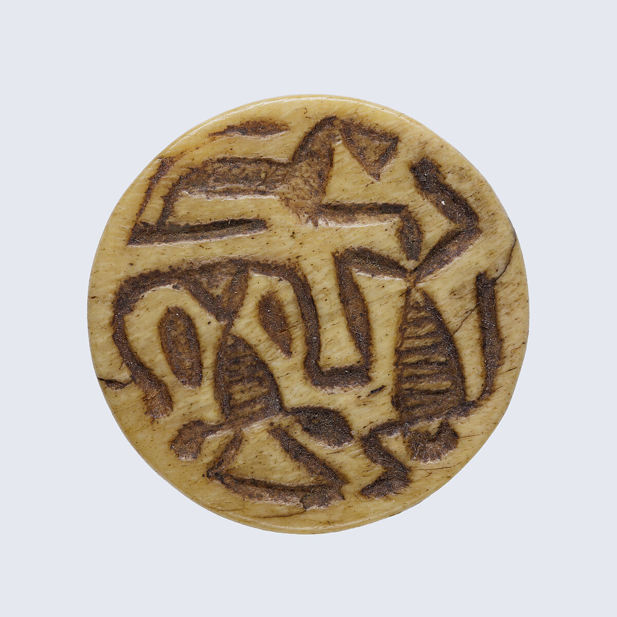 A recent study has cast considerable light on the motifs and their amuletic significance. This large bone or ivory button form design amulet represents an early attestation of the myth of the sun’s eye. The myth recounts the withdrawal of Re’s daughter Tefnut/Hathor, identified with his eye, to live as a wild lion in deserts far from Egypt. She is lured back through magical spells by Thoth and Shu, and her contentment is maintained by cult observations including dance and music performed by demons. The lion here represents her aspect expressed in the desert withdrawal, the Hathor/Bat form element on this base represents the contented goddess, and the dancing demon the cult that calms her.
