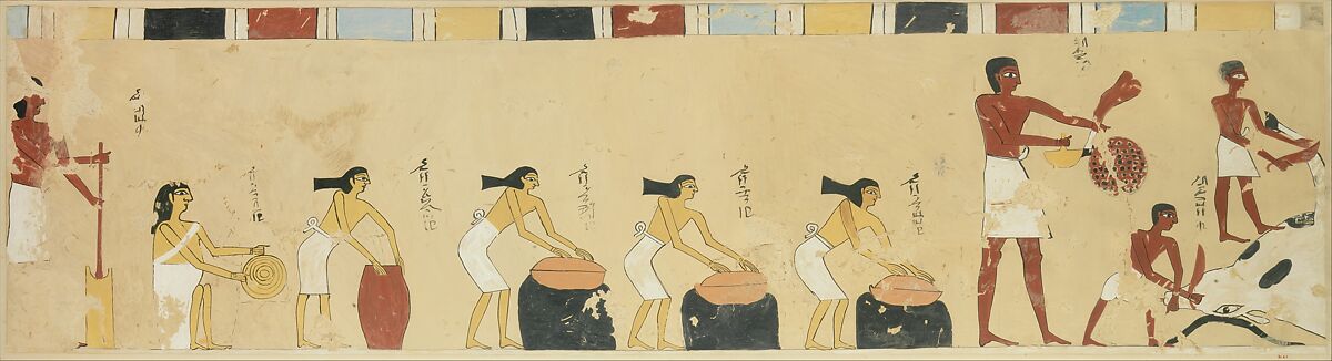 This facsimile painting copies a scene depicting women making bread and men slaughtering cattle. From the tomb of Djari (TT 366) in western Thebes.
