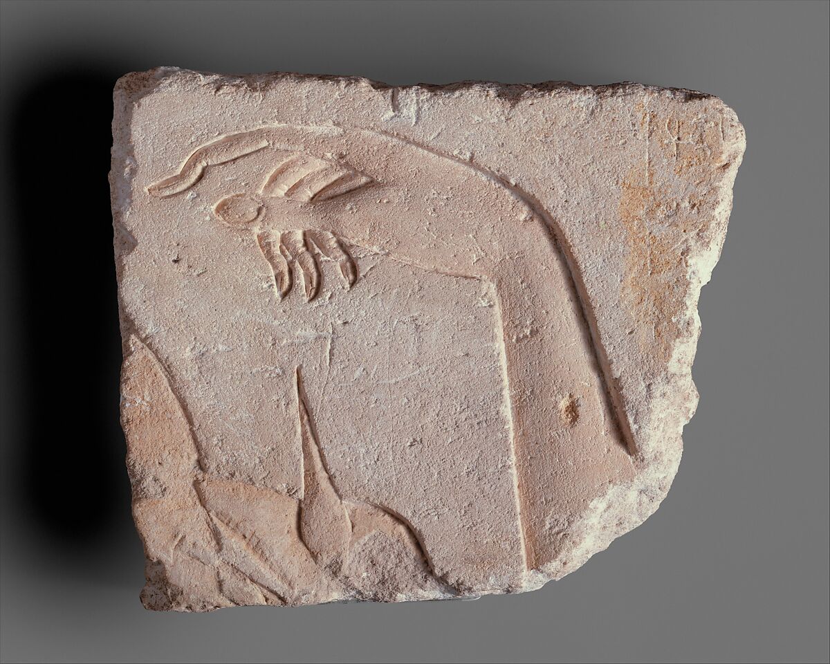 Relief decoration in the Amarna temples included naturalistic details, such as this one, and transitory gestures that are unique in Egyptian art. Here, the gesture of a queen's hand was captured at the moment she pointed out marsh fowl to the king during a hunting interlude. The languid grace of the bent wrist and the sensitivity of the long fingers - represented with an unusual sense of perspective that depicts the thumb and index finger in the foreground - express perfectly the essence of Amarna art.