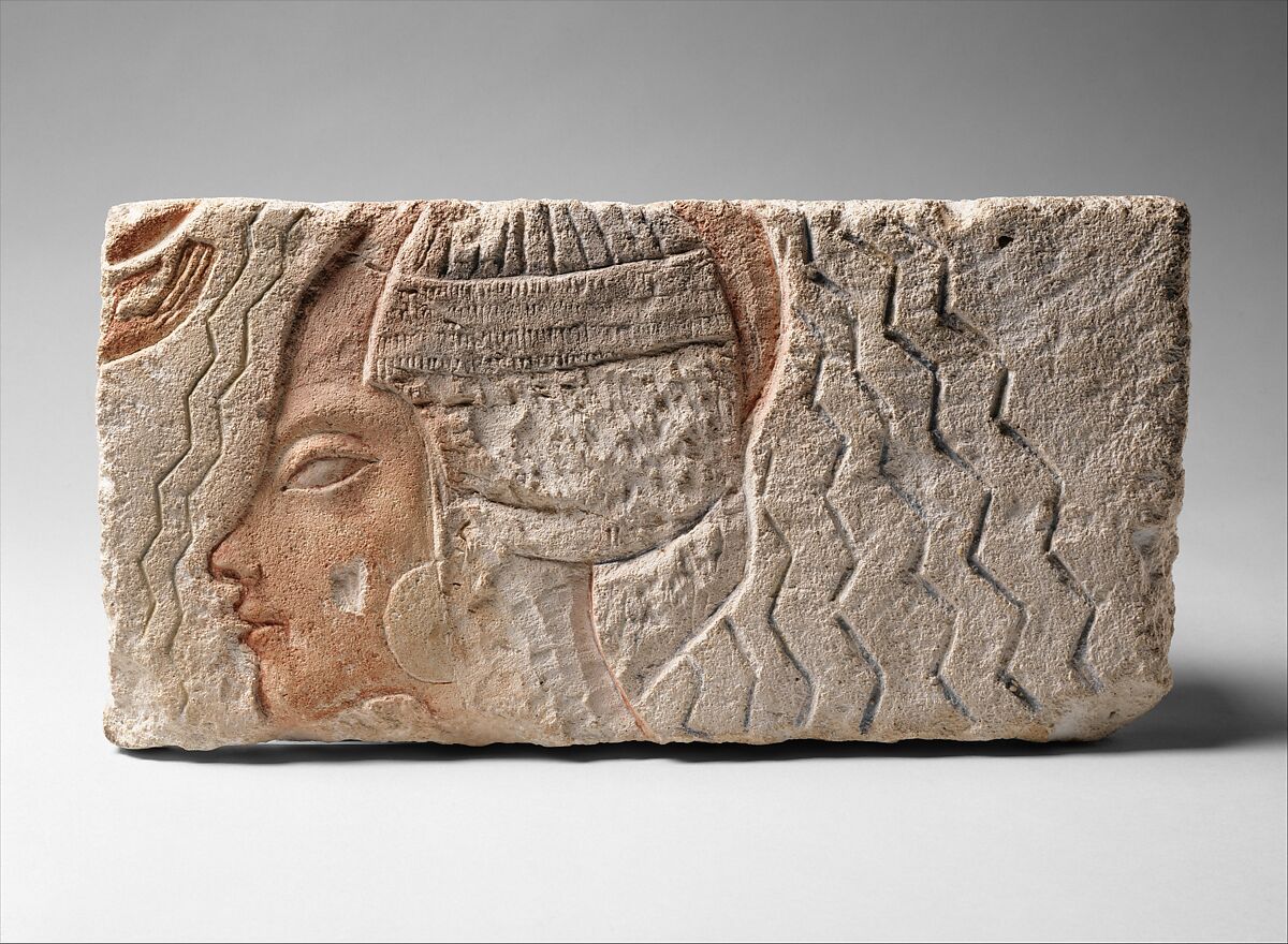 This fragment is from a scene showing a royal woman undergoing a ritual of purification. The zigzag lines represent water being poured over her head from a jar held by the small hand at the upper left of the relief. The woman originally wore a Nubian wig similar to the one carved on a canopic jar lid from this period (see 30.8.54). Later the wig was filled in with gypsum plaster, which was modeled and recarved into the elaborately dressed sidelock of hair worn by Akhenaten's daughters, but some of the plaster has fallen out. Judging by the facial features and the original wig, the figure probably was intended to represent Queen Kiya, a beloved secondary wife of Akhenaten. This queen seems to have died several years before the end of the king's reign, and her images were invariably altered to represent one of his older daughters, as on this relief.