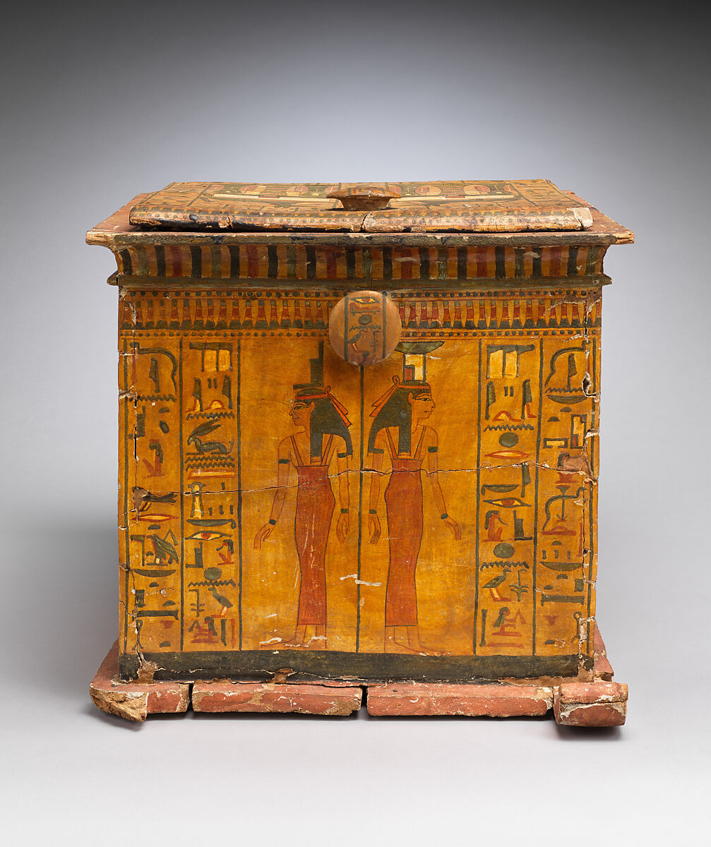 The canopic box, made for Khonsu (see 86.1.1a, b and 86.1.2a, b), has a shrine-shaped lid and the typical Egyptian cavetto cornice around the upper edge. It is built on sledge runners, and there are two knobs for tying the lid shut. The interior is divided into four compartments for the storage of the four internal organs. The lid is decorated with two images of Anubis as a jackal, and the sides of the box are decorated with the goddesses Isis and Nephthys, Selqet and Neit, and the Four Sons of Horus, protectors of the internal organs. The inscriptions assure Khonsu of their protection. Other objects in the collection that were discovered in the same tomb can be viewed here.
