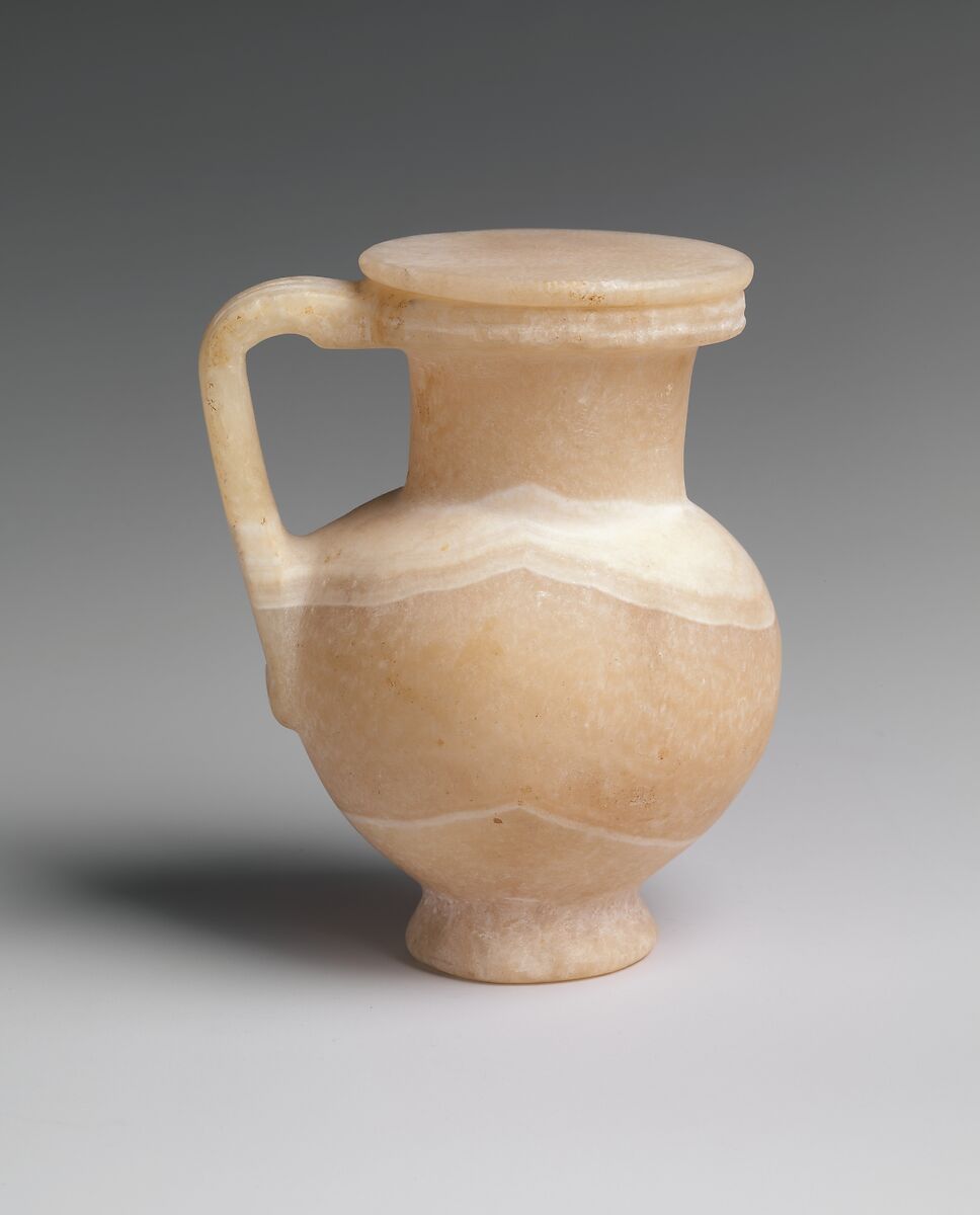 The lidded jug of Egyptian alabaster was excavated by the Museum's Egyptian Expedition in 1916. It had been placed near the head of a coffin along with a number of other objects that came to the Museum when the finds were divided with the Egyptian Antiquities Service. These include two other alabaster jars (16.10.421, 16.10.423), one small ointment jar of serpentine (16.10.422), two pottery vessels (16.10.427–.428), a small ivory cosmetic box (16.10.425), and three ivory combs (16.10.428–.430)